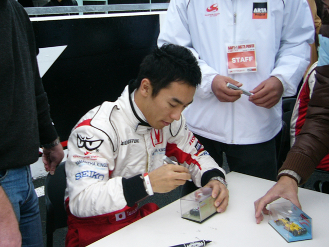 先ほどもらった整理券の選手のところに行きサインをもらったのですがそのヨコの方には琢磨選手や左近選手、井出選手がサインをしているので、本当はサインをもらったら出て行かなきゃいけないところをうまいことかいくぐり写真を撮っていました。