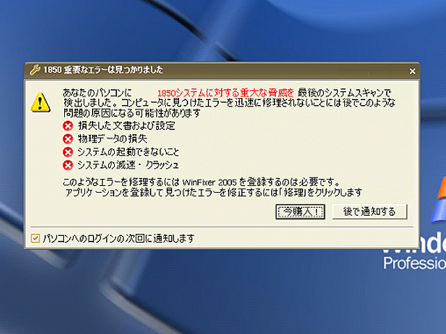 〝注意:レジストリデータベース、システムファイルにあるエラーによってコンピュータは機能が正しくなくて、フリーズ、クラッシュの恐れもあります。エラーを修正するとコンピュータパフォーマンスが向上してデータ損失ができなくなります。無料でコンピュータをスキャンするようにErrorSafeをインストールしますか?(推奨)〝