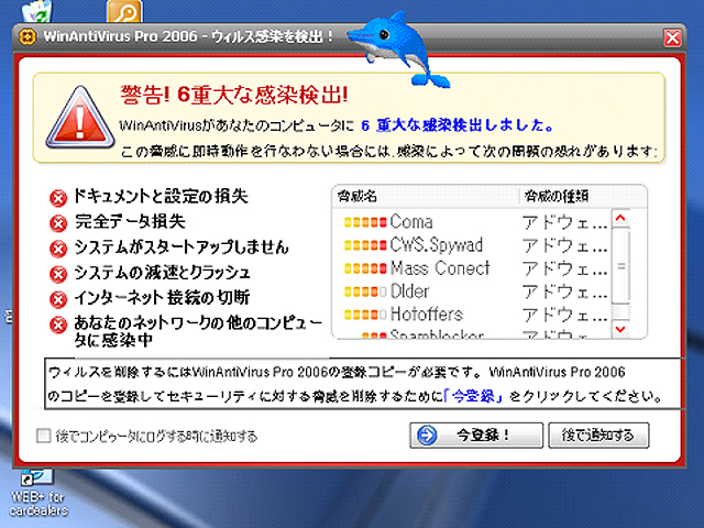 うっかり入れてしまったらセーフモードで立ち上げシステムの復元で元に戻せば何とかなります。いつかかかったかわからんときはひとまずアンインストールしフリーソフトのスパイボットやアドウェアで削除しましょう。ただし見えないところにファイルのカスが残るのでまた入って来てしまいます。そんな時は「アダルトサイト被害対策の部屋http://www.higaitaisaku.com/」にいけば解決方法が載っています。参考にしてぶっ潰してください。ちなみに下記の写真は最近よく出てくるインチキアンチウィルスの「WinAntiVirus2006」のサイトに意を決してアクセスし、キャプチャーしてきた画像です。日本語がかなりおかしいのと「現在使用しているアンチウィルスは効果的ではありません」と「無限ファイヤーウォール」が笑えます。